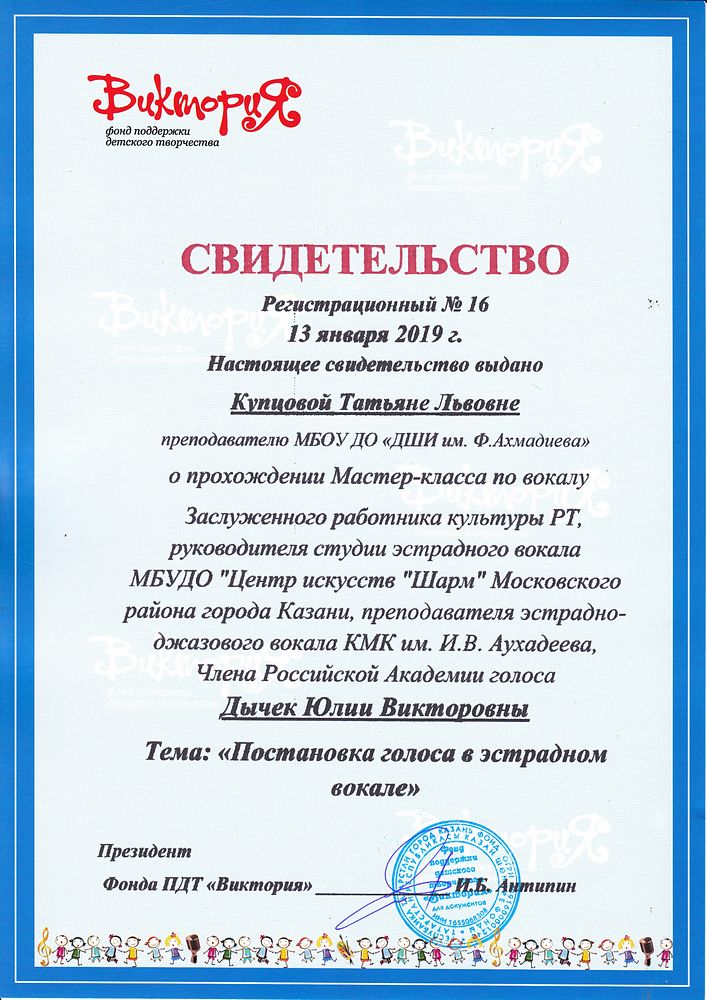 - Купцова Татьяна Львовна - Прохождение мастер-класса по вокалу Заслуженного работника культуры РТ Дычек Юлии Викторовны - Тема "Постановка голоса в эстрадном вокале" (январь 2019г.)