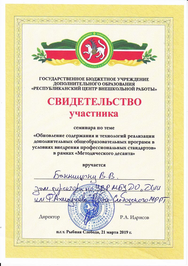 Банницын Владимир Валентинович - Участие в семинаре по теме "Обновление содержания и технологий реализации дополнительных общеобразовательных программ в условиях внедрения профессиональных стандартов" в рамках "Методического десанта" (март 2019г.)