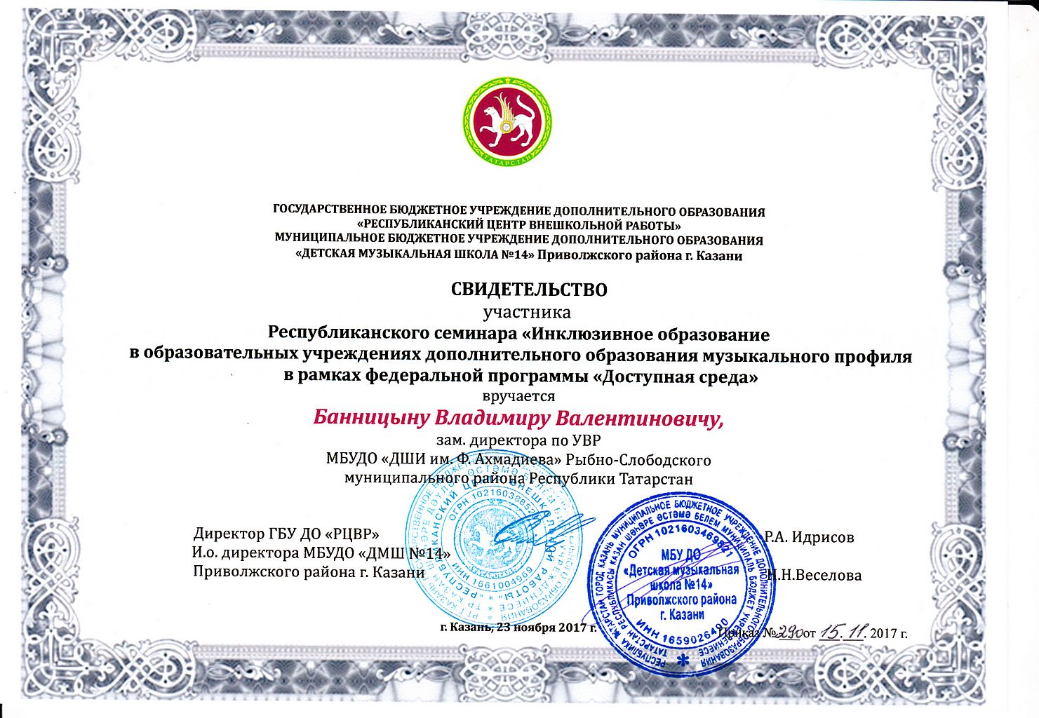 Банницын Владимир Валентинович - Свидетельство участника Республиканского семинара "Инклюзивное образование в образовательных учреждениях дополнительного образования музыкального профиля в рамках федеральной программы "Доступная среда" (ноябрь 2017г.)