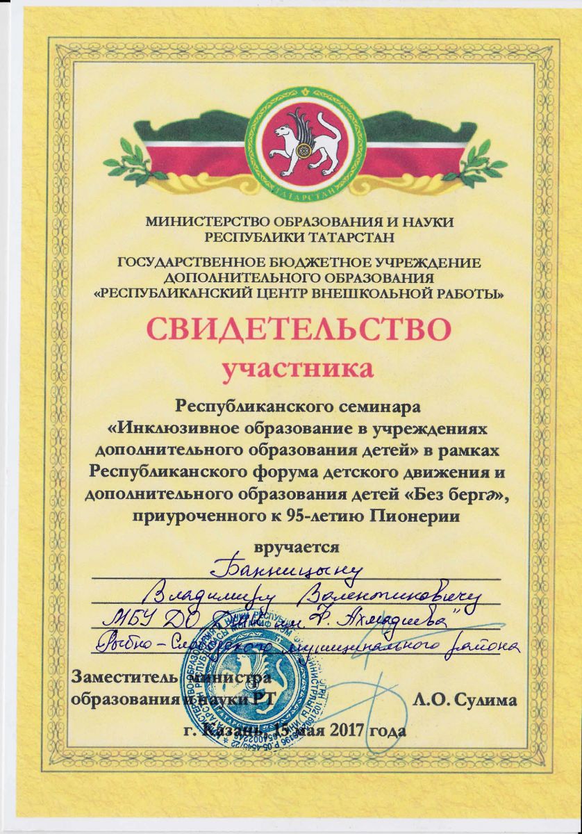 - Банницын Владимир Валентинович - Сертификат участника Республиканского семинара "Инклюзивное образование в учреждениях дополнительного образования детей" в рамках Республиканского форума детского движения дополнительного образования детей "Без берге", приуроченного к 95-летию пионерии (май 2017г.)