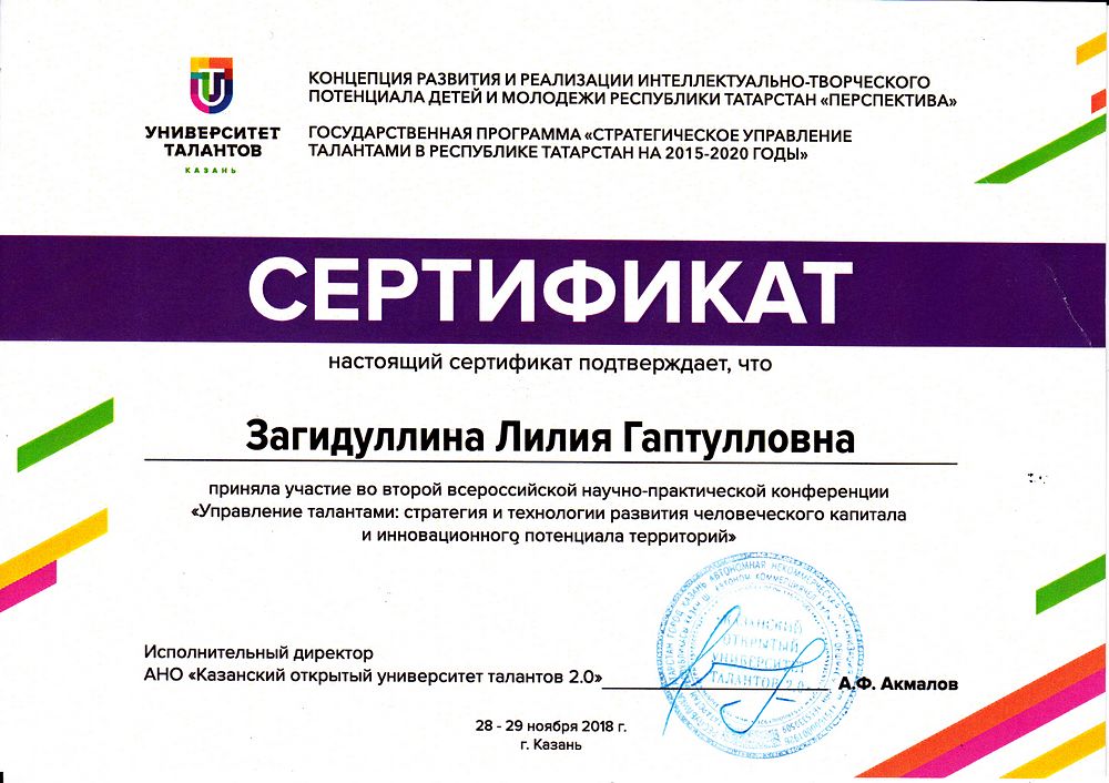 Загидуллина Лилия Гаптулловна - Участие во второй всероссийской научно-практической конференции "Управление талантами: стратегия и технологии развития человеческого каптитала и инновационного потенциала территорий" (ноябрь 2018г.)