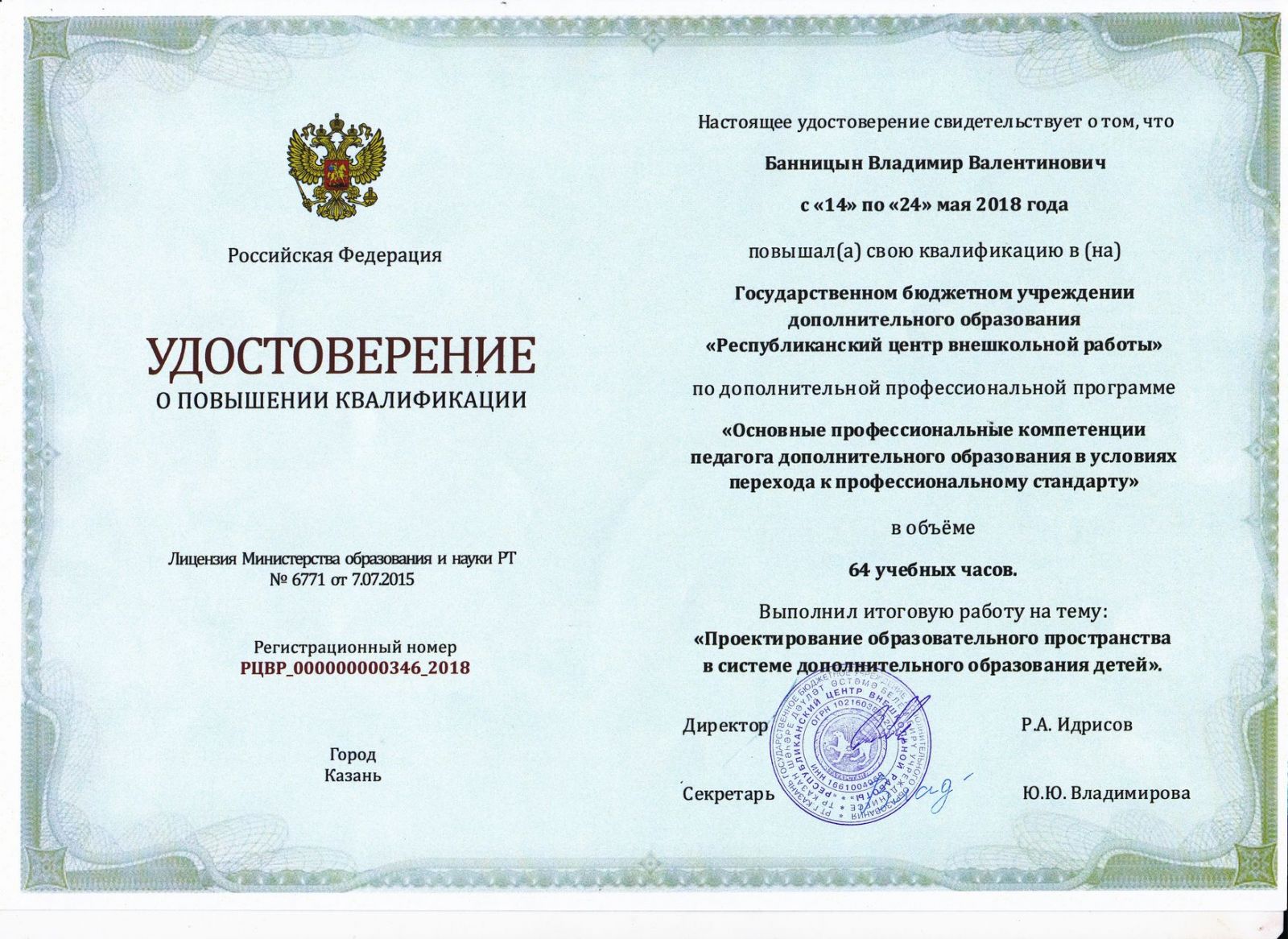 - Банницын Владимир Валентинович - Курсы повыщения квалификации по программе "Основные профессиональные компетенции педагога дополнительного образования в условиях перехода к профессиональному стандарту"(май 2018г.)