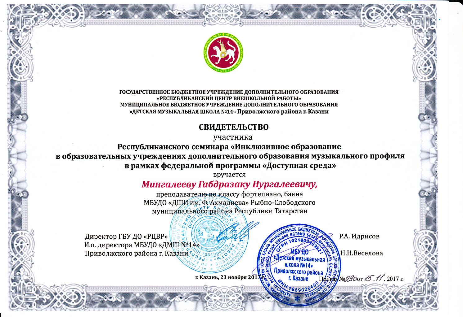 - Мингалеев Габдразак Нургалеевич - Свидетельство участника Республиканского семинара "Инклюзивное образование в образовательных учреждениях дополнительного образования музыкального профиля в рамках федеральной программы "Доступная среда"(ноябрь 2017г.)