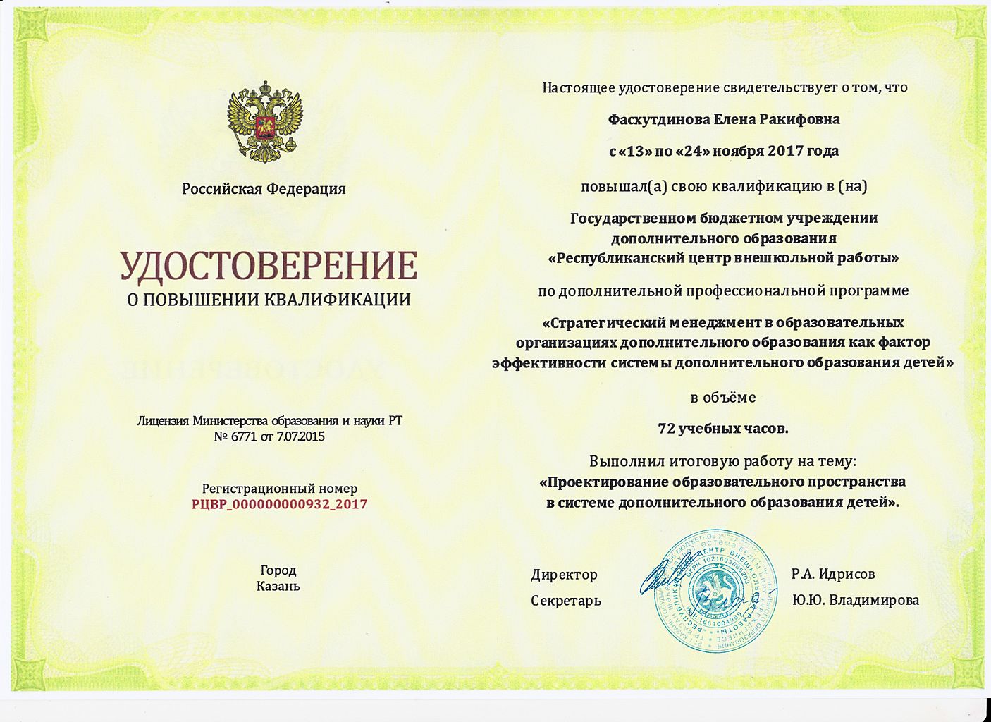 - Фасхутдинова Елена Ракифовна - Курсы повышения квалификации по программе "Стратегический менджмент в образовательных организациях дополнительного образования как фактор эффективности системы дополнительного образования детей" (ноябрь 2017г.)