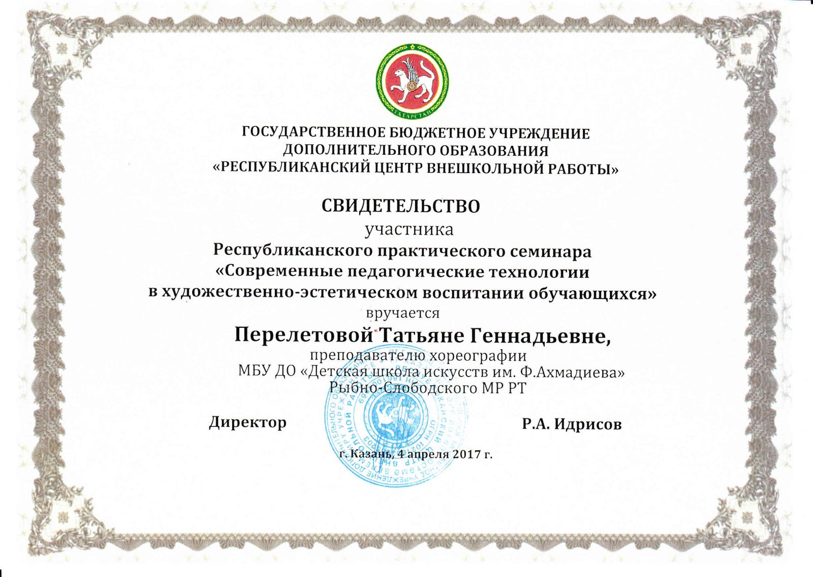 Перелетова Татьяна Геннадьевна - Свидетельство участника Республиканского практического семинара "Современные педагогические технологии в художественно-эстетическом воспитании обучающихся" (апрель 2017г.)