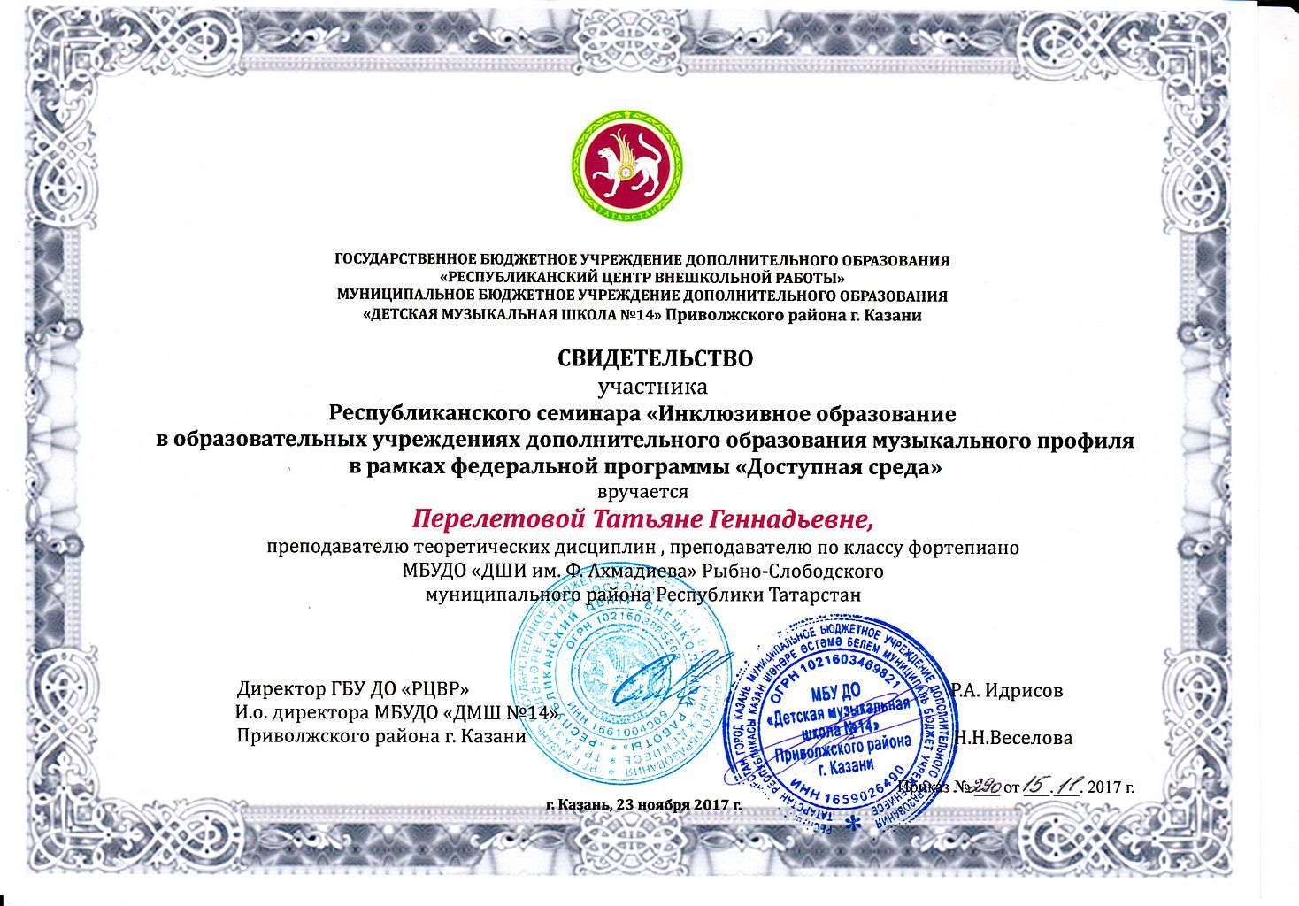 - Перелётова Татьяна Геннадьевна - Свидетельство участника Республиканского семинара "Инклюзивное образование в образовательных учреждениях дополнительного образования музыкального профиля в рамках федеральной программы "Доступная среда"(ноябрь 2017г.)
