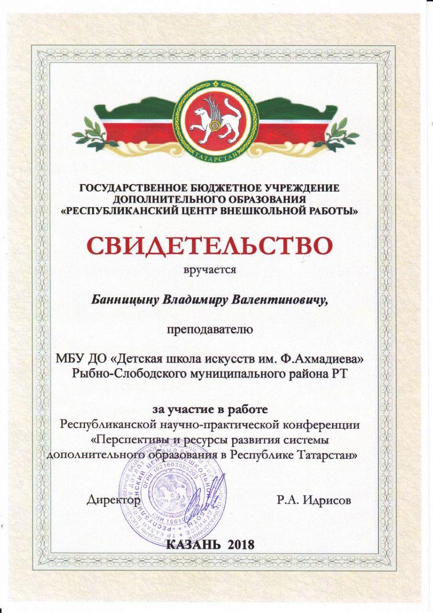- Банницын Владимир Валентинович - Участие в Республиканской научно-практической конференции "Перспективы и ресурсы развития системы дополнительного образования в Республике Татарстан" (февраль 2018г.)