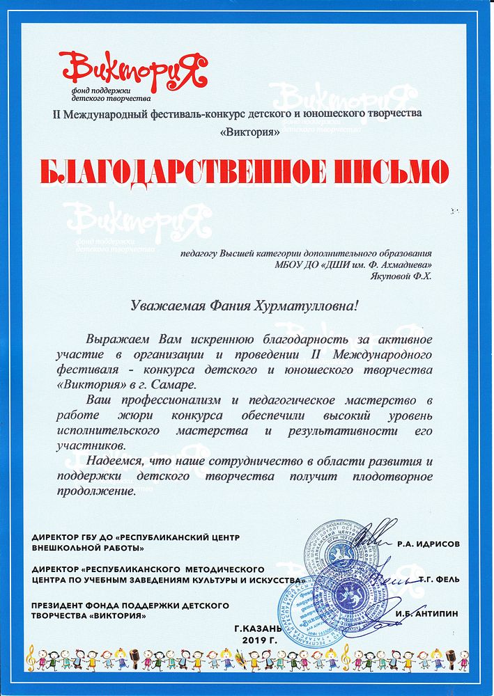 - Якупова Фания Хурматулловна - Участие в работе жюри II-го Международного фестиваля-конкурса детского и юношеского творчества "Виктория" ( 2019г. г. Самара)