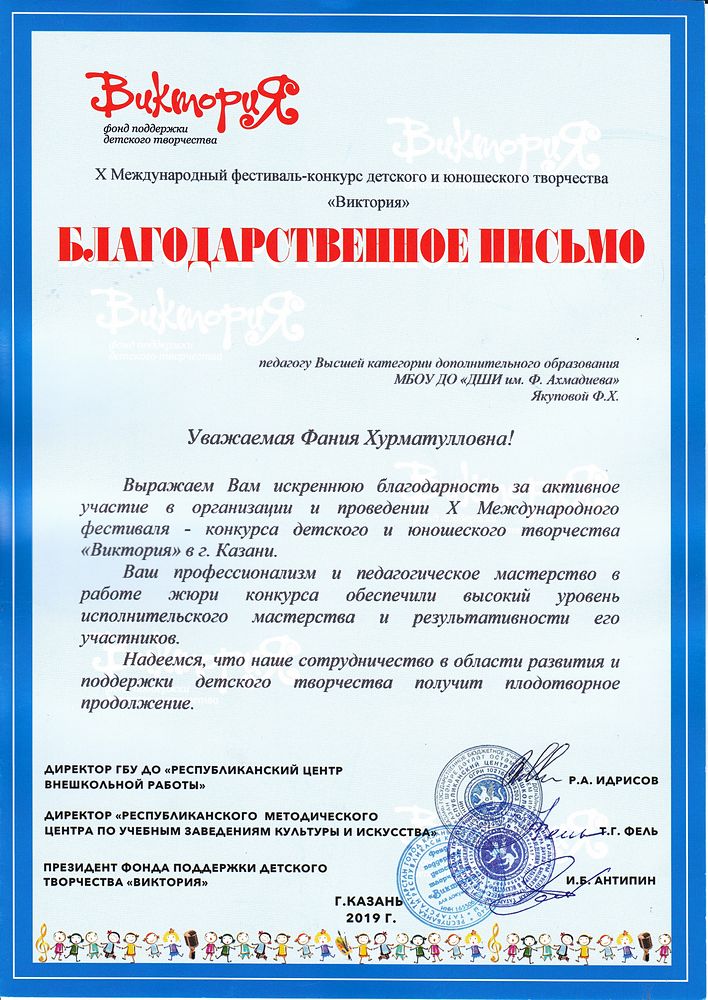 - Якупова Фания Хурматулловна - Участие в работе жюри X-го Международного фестиваля-конкурса детского и юношеского творчества "Виктория" (2019г. г. Казань)