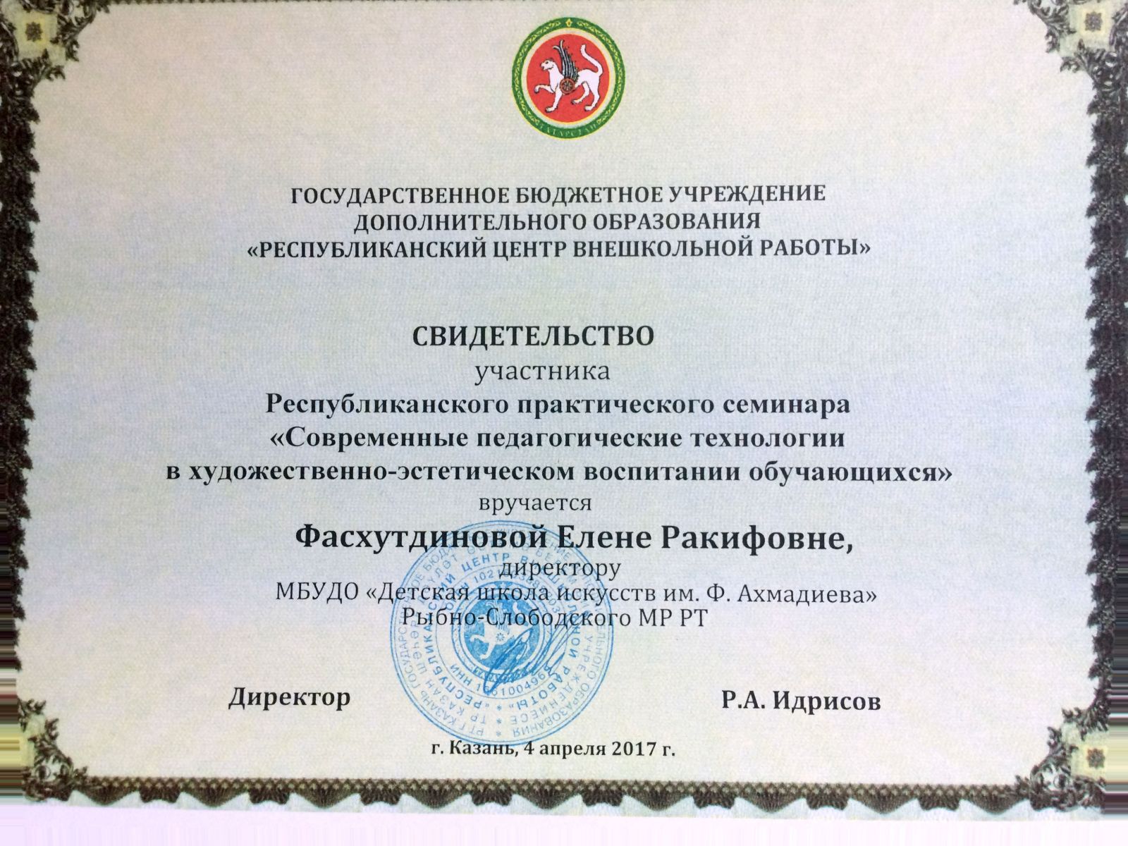 - Фасхутдинова Елена Ракифовна - Свидетельство участника Республиканского практического семинара "Современные педагогические технологии в художественно-эстетическом воспитании обучающихся" (апрель 2017г.)
