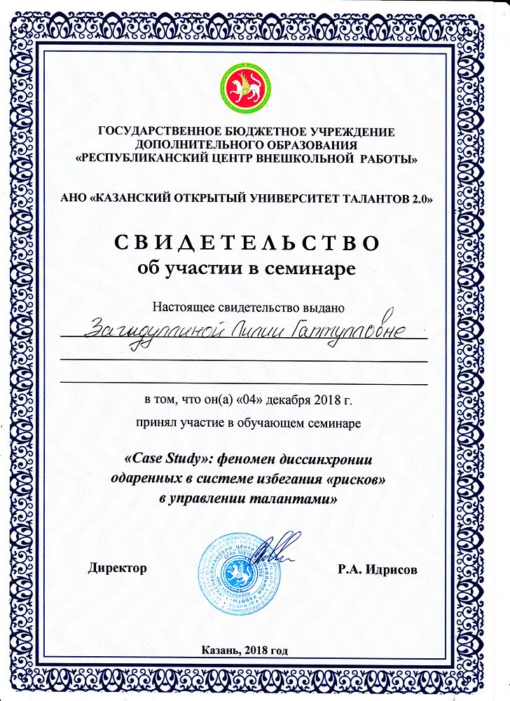 Загидуллина Лилия Гаптулловна - Участие в обучающем семинаре "Case Study": феномен дисинхрониии одаренных в системе избегания "рисков" в управлении талантами" (2018г.)