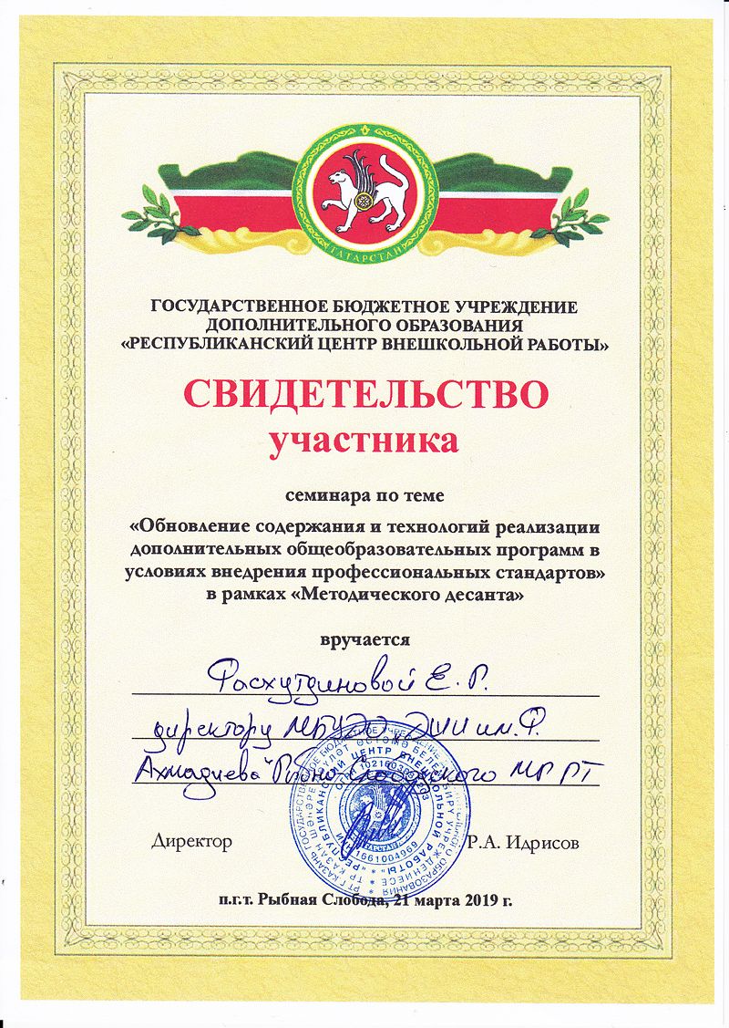 - Фасхутдинова Елена Ракифовна - Участие в семинаре по теме "Обновление содержания и технологий реализации дополнительных общеобразовательных программ в условиях внедрения профессиональных стандартов" в рамках "Методического десанта" (март 2019г.)