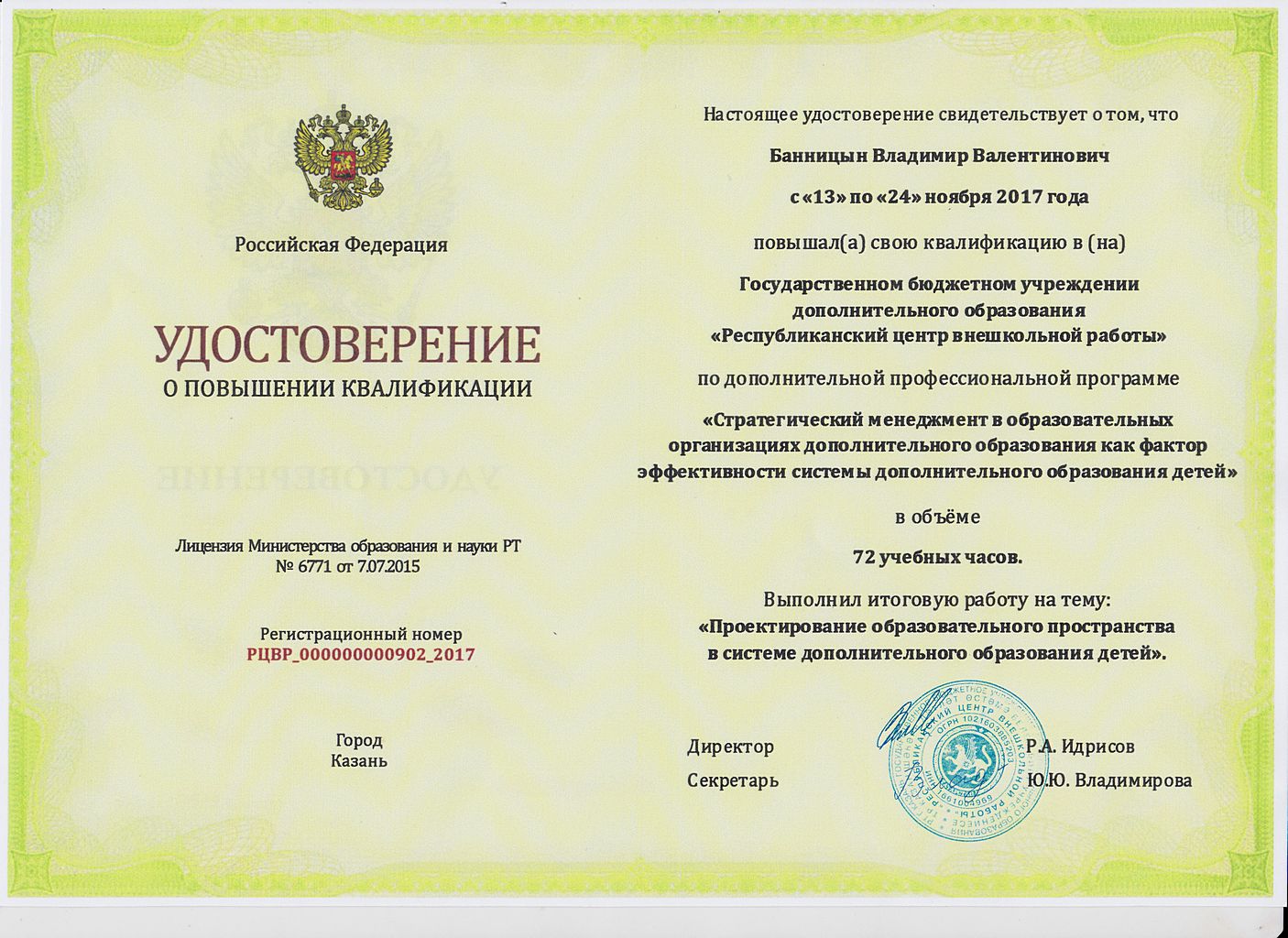 Банницын Владимир Валентинович - Курсы повышения квалификации по программе "Стратегический менджмент в образовательных организациях дополнительного образования как фактор эффективности системы дополнительного образования детей" (ноябрь 2017г.)