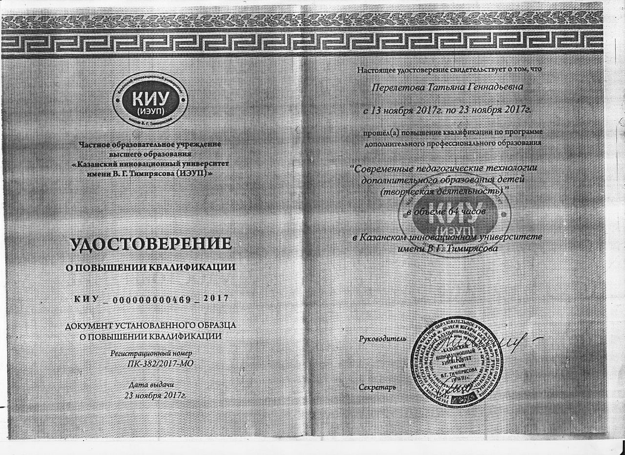 - Перелётова Татьяна геннадьевна - Курсы повышения квалификации по программе "Современные педагогические технологии дополнительного образования детей (творческая деятельность)" (ноябрь 2017г.)