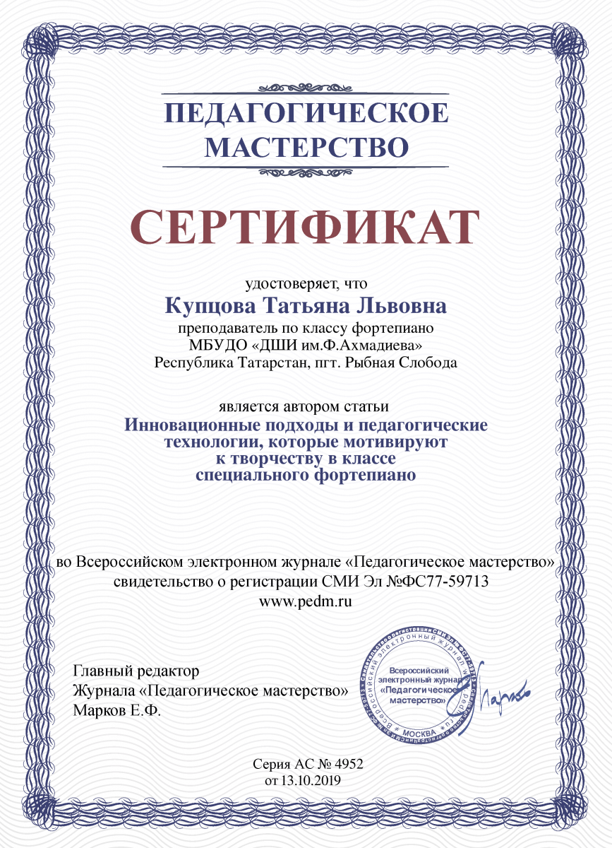 - Купцова Татьяна Львовна - Статья "Инновационные подходы и педагогические технологии, которые мотивируют к творчеству в классе специального фортепиано" во Всероссийском журнале "Педагогическое мастерство" (октябрь 2019г.)