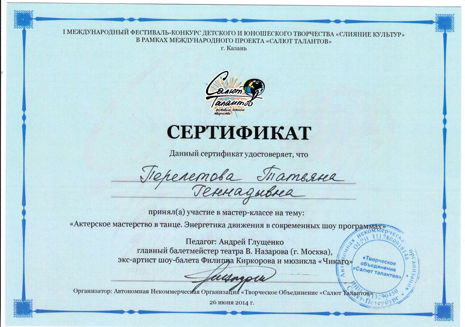 Участие в мастер-классе на тему "Актерское мастерство в танце. Энергетика движения в современных шоу-программах" I-го международного фестиваля-конкурса детского и юношеского творчества "Слияние культур" в рамках международного проекта "Салют талантов" (2014г.)
