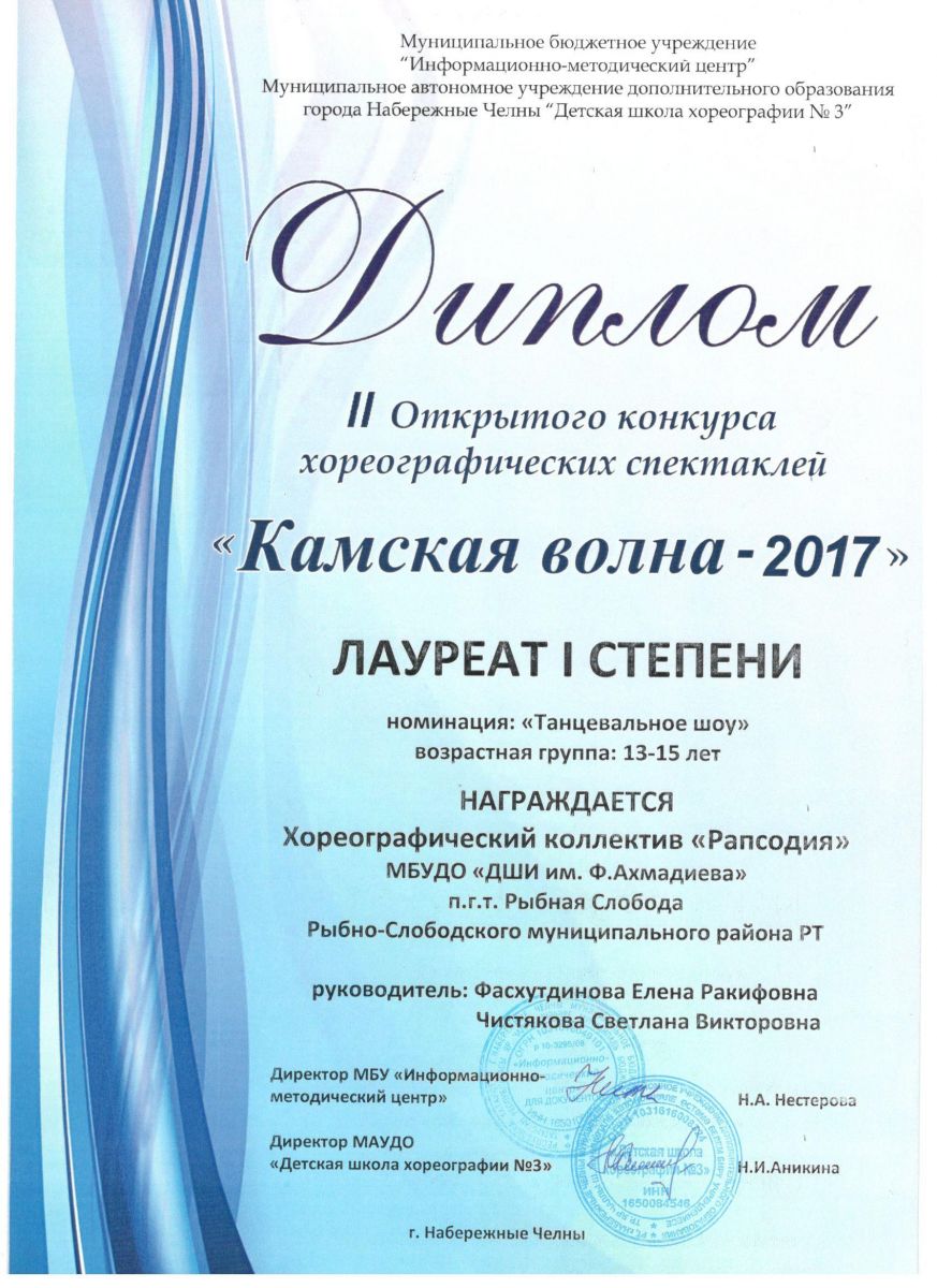 - Хореографический коллектив "Рапсодия" - Диплом лауреата I-й степени II-го Открытого конкурса хореографических спектаклей "Камская волна - 2017" в номинации "Танцевальное шоу" возрастная группа 13-15 лет (январь 2018г.)