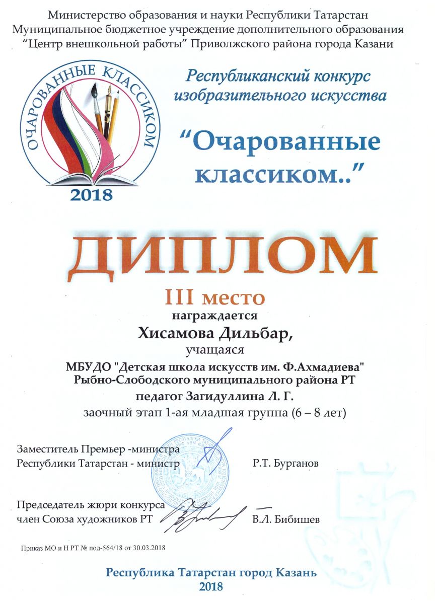 Дильбар Хисамова - Диплом III-й степени Республиканского конкурса изобразительного искусства "Очарованные классиком...." (апрель 2018г.)
