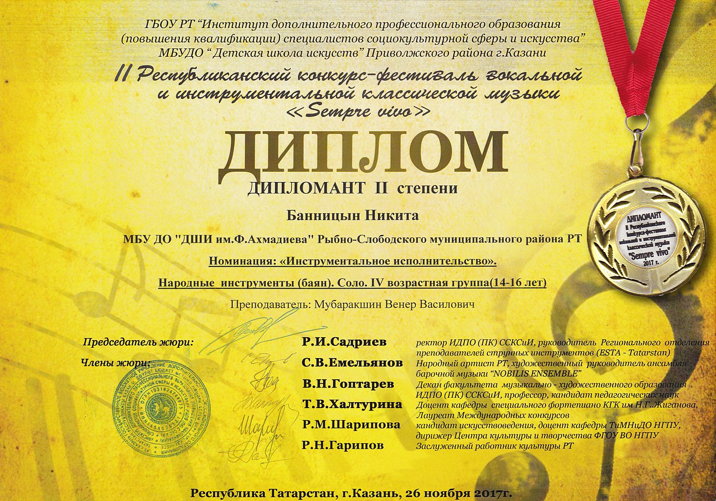 - Вагизов Рифат - Диплом дипломанта III-й степени II-го Республиканского конкурса-фестиваля вокальной и инструментальной классической музыки "Sempre vivo" в номинации "Инструментальное исполнительство" Фортепиано. Соло. I-я возрастная группа (7-8 лет)(ноябрь 2017г.)
