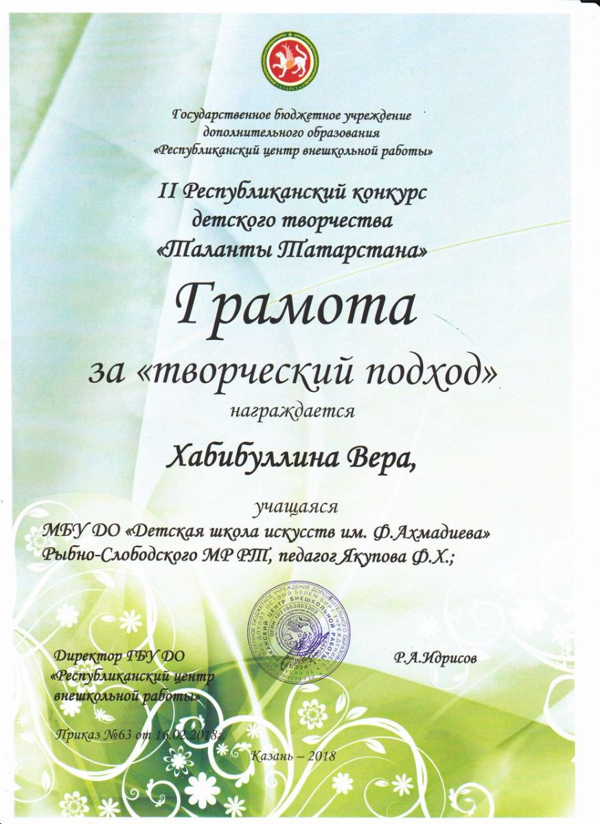 - Хабибуллина Вера - Грамота "За творческий подход" во II-м Республиканском конкурсе детского творчества "Таланты Татарстана" (май 2018г.)