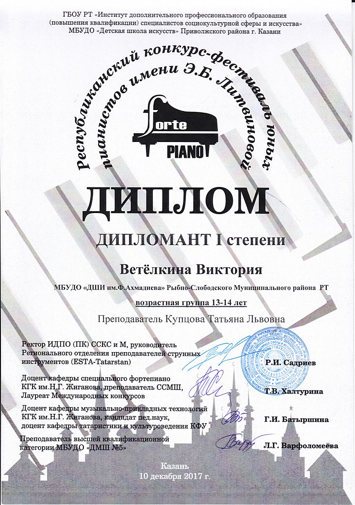 - Ветелкина Виктория - Диплом дипломанта I-й степени Республиканского конкурса-фестиваля юных пианистов имени Э.Б.Литвиновой "FortePIANO" в возрастной группе 13-14 лет (декабрь 2017г.)