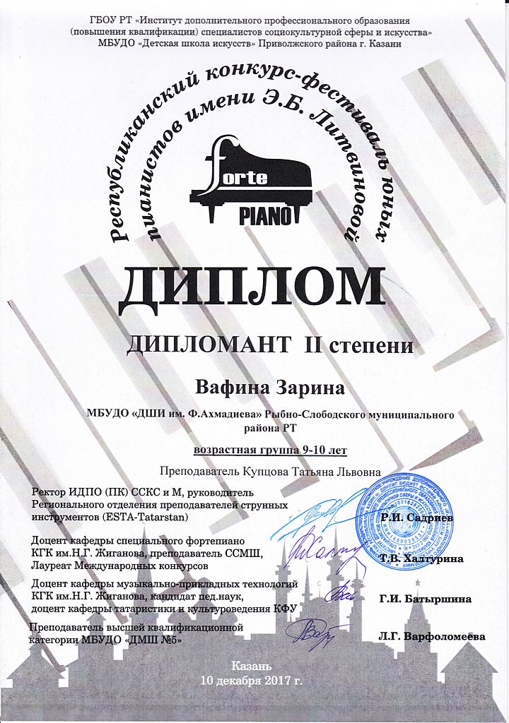 - Вафина Зарина - Диплом дипломанта II-й степени Республиканского конкурса-фестиваля юных пианистов имени Э.Б.Литвиновой "FortePIANO" в возрастной группе 9-10 лет (декабрь 2017г.)