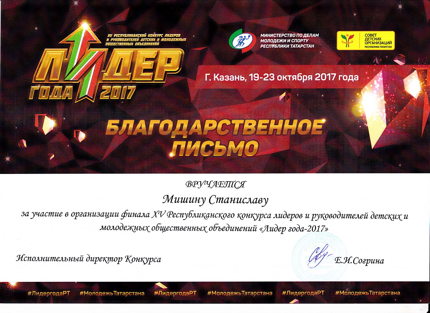 Мишин Станислав - Благодарственное письмо за участие в организации XV-го Республиканского конкурса лидеров и руководителей детских и молодежных общественных объединений "Лидер года - 2017"(октябрь 2017г.)
