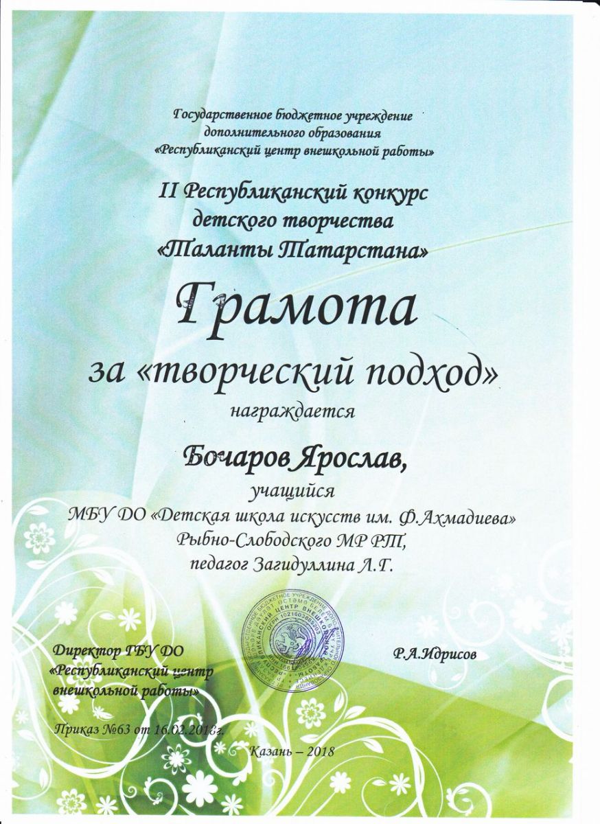 - Бочаров Ярослав - Грамота "За творческий подход" во II-м Республиканском конкурсе детского творчества "Таланты Татарстана" (май 2018г.)