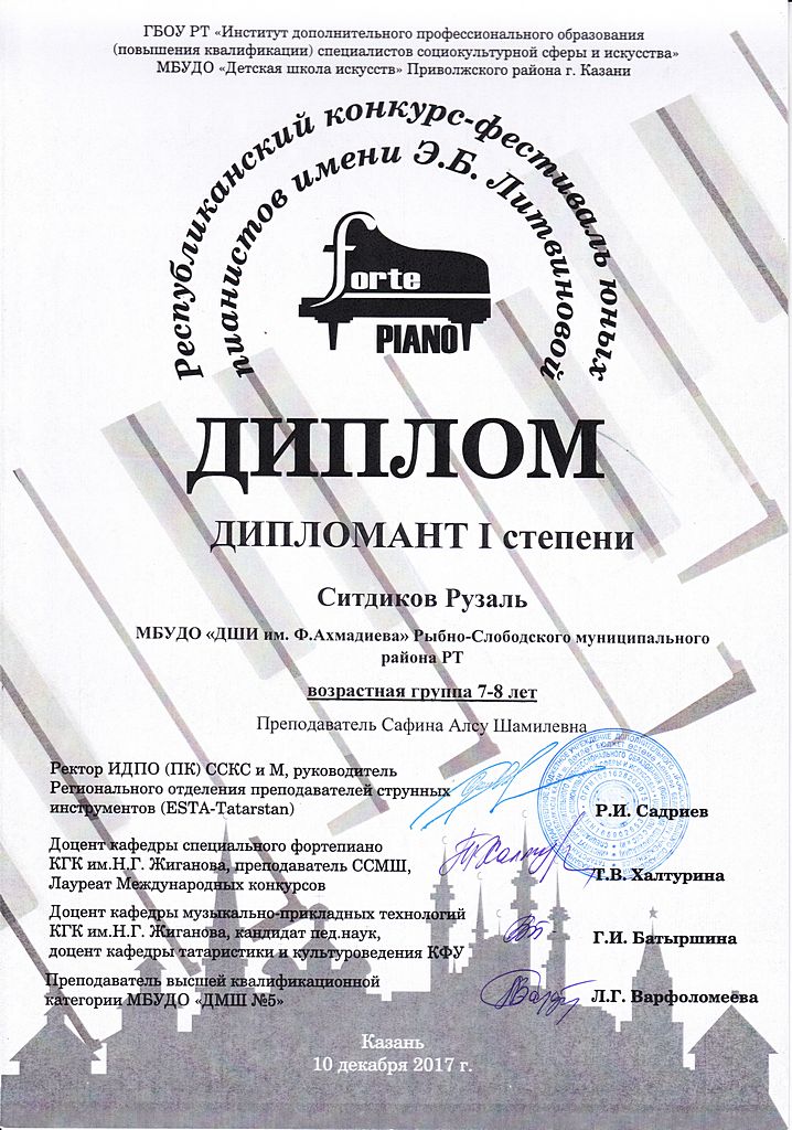 - Ситдиков Рузаль - Диплом дипломанта I-й степени Республиканского конкурса-фестиваля юных пианистов имени Э.Б.Литвиновой "FortePIANO" в возрастной группе 7-8 лет (декабрь 2017г.)