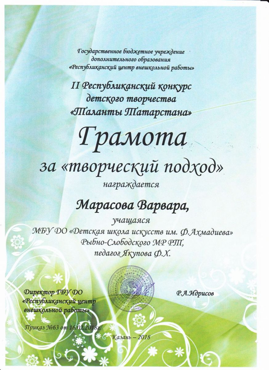 - Марасова Варвара - Грамота "За творческий подход" во II-м Республиканском конкурсе детского творчества "Таланты Татарстана" (май 2018г.)