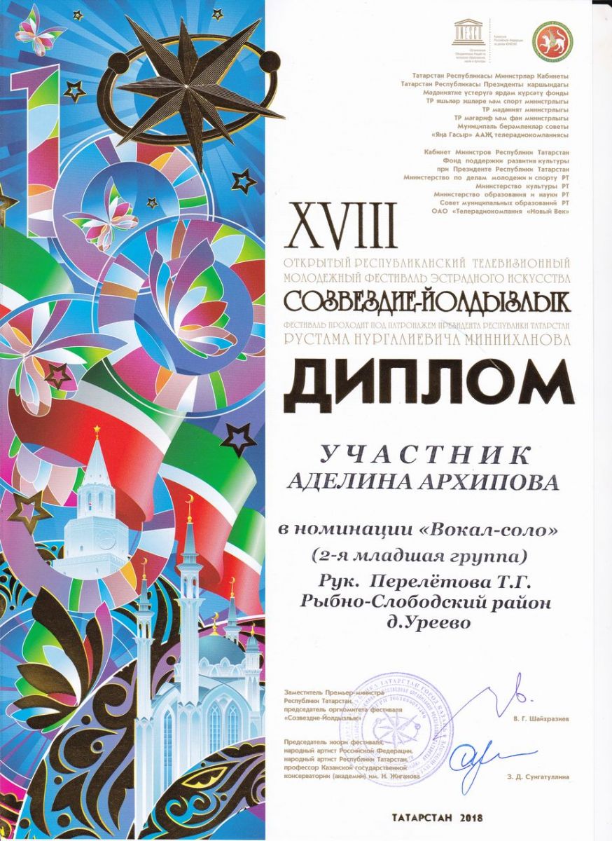 - Архипова Аделина - Диплом участника XVIII-го Открытого Республиканского телевизионного молодежного фестиваля эстрадного искусства "Созвездие-Йолдызлык" в номинации "Вокал-Соло. 2-я младшая группа" (март 2018г.)
