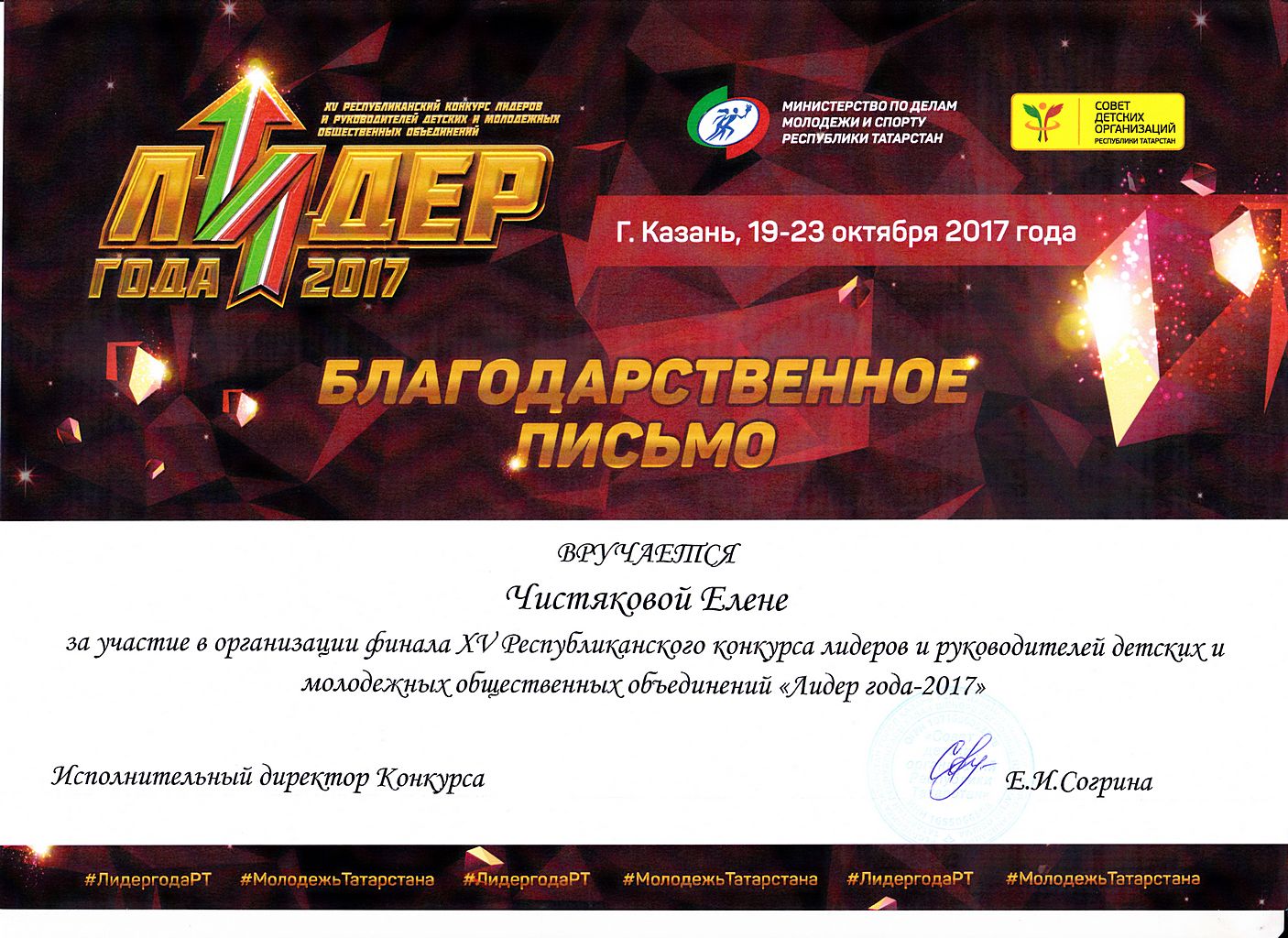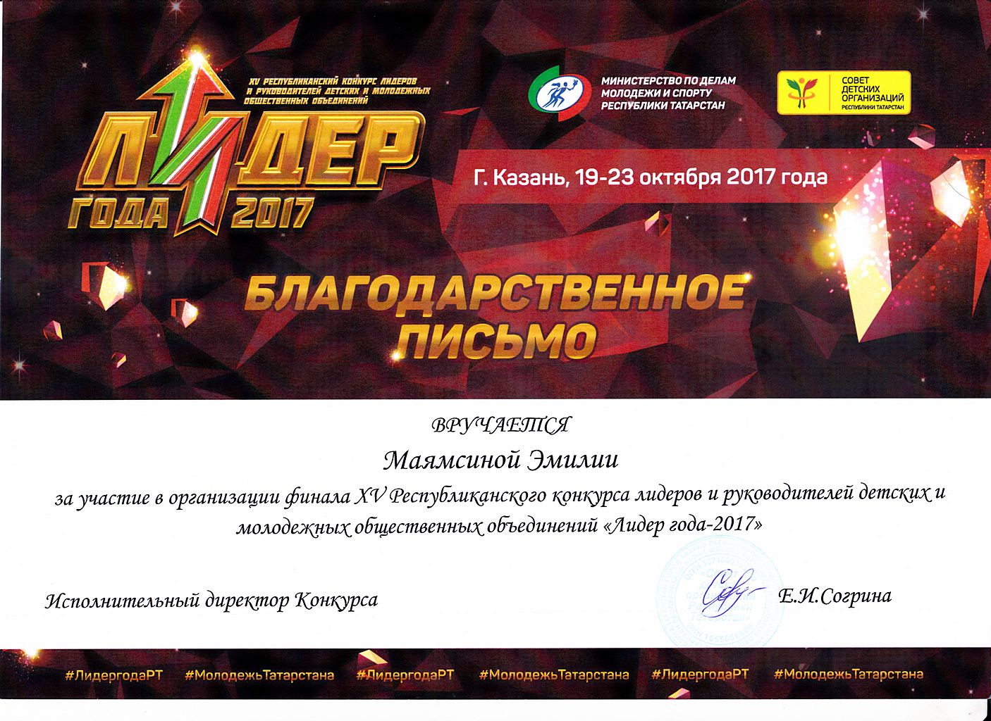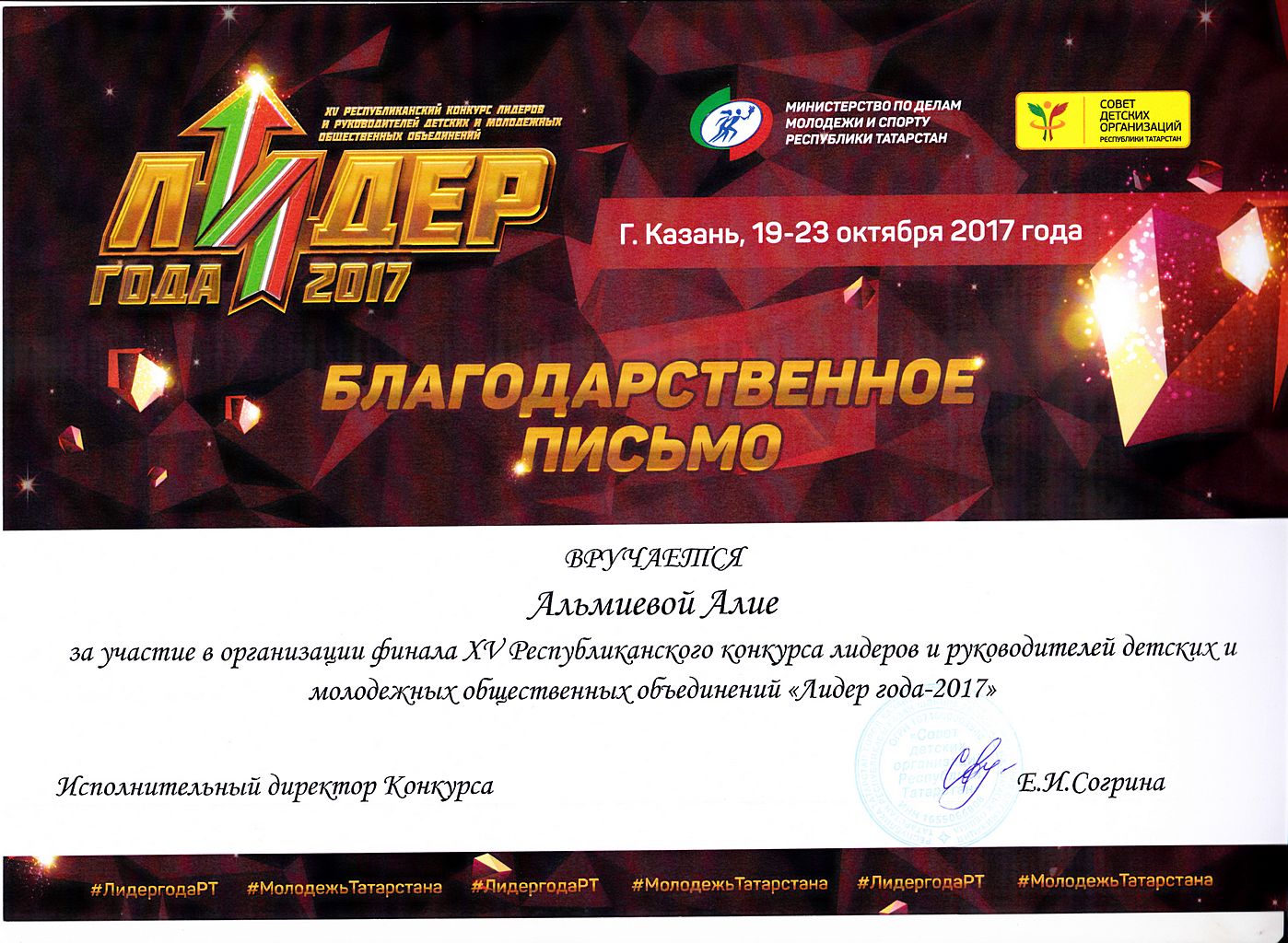 - Гатиятуллина Эльвина - Благодарственное письмо за участие в организации XV-го Республиканского конкурса лидеров и руководителей детских и молодежных общественных объединений "Лидер года - 2017" (октябрь 2017г.)