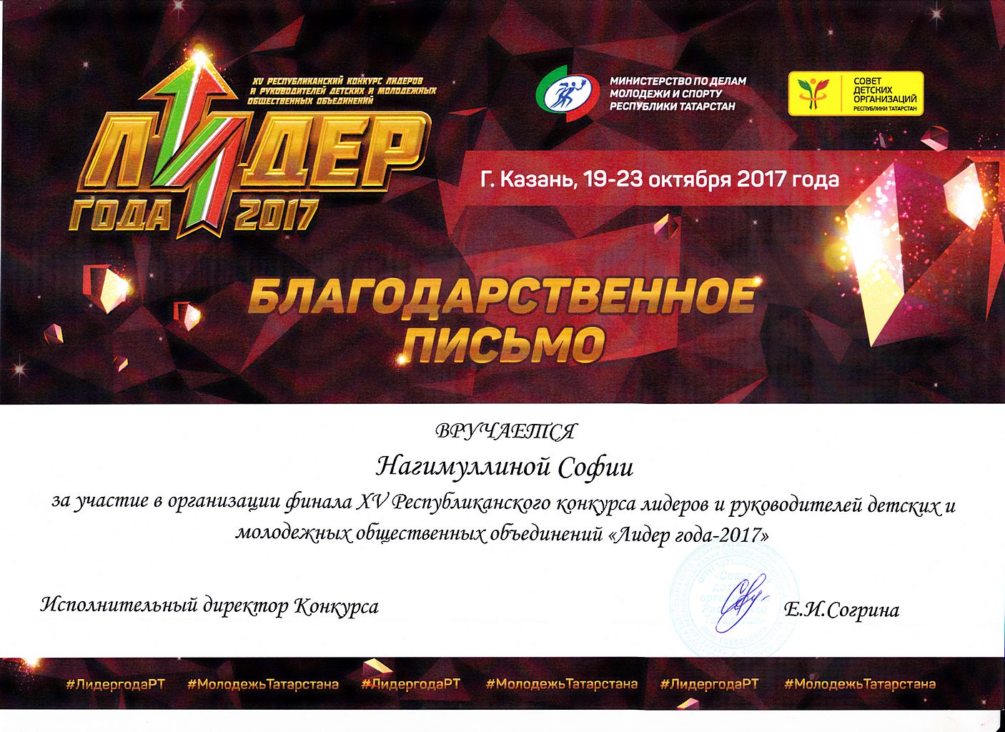 - Нагимуллина София - Благодарственное письмо за участие в организации XV-го Республиканского конкурса лидеров и руководителей детских и молодежных общественных объединений "Лидер года - 2017" (октябрь 2017г.)
