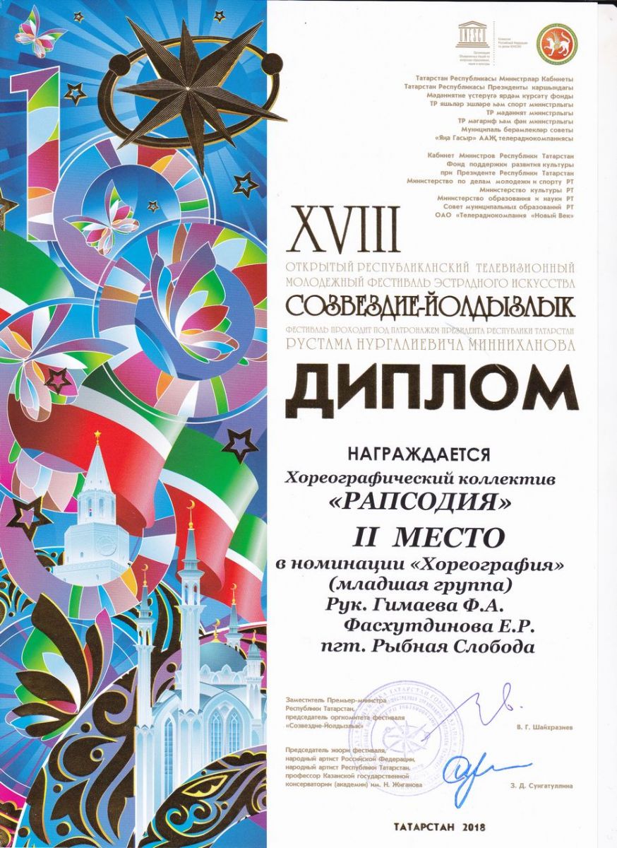 - Хуснутдинова Резеда - Диплом участника XVIII-го Открытого Республиканского телевизионного молодежного фестиваля эстрадного искусства "Созвездие-Йолдызлык" в номинации "Вокал-Соло. 2-я младшая группа" (март 2018г.)
