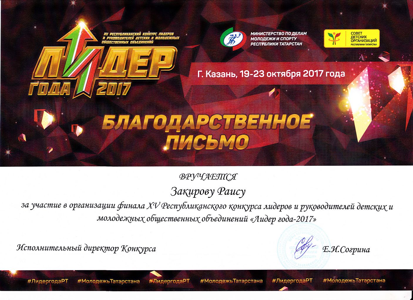 - Ахметзянов Ислам - Благодарственное письмо за участие в организации XV-го Республиканского конкурса лидеров и руководителей детских и молодежных общественных объединений "Лидер года - 2017" (октябрь 2017г.)