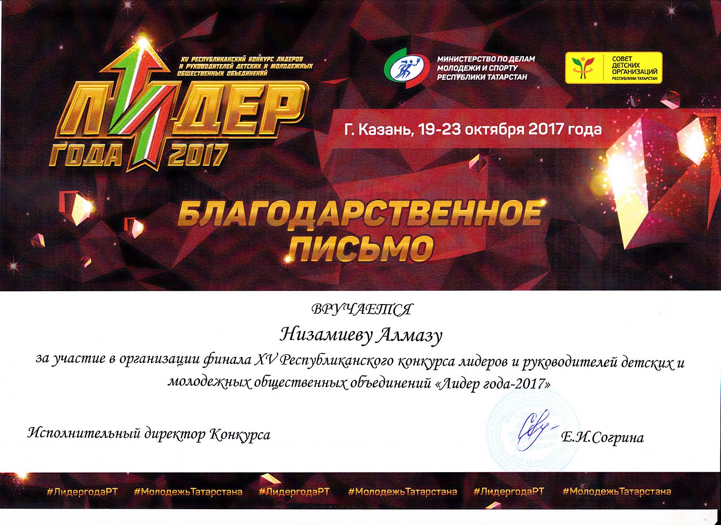 - Низамиев Алмаз - Благодарственное письмо за участие в организации XV-го Республиканского конкурса лидеров и руководителей детских и молодежных общественных объединений "Лидер года - 2017" (октябрь 2017г.)
