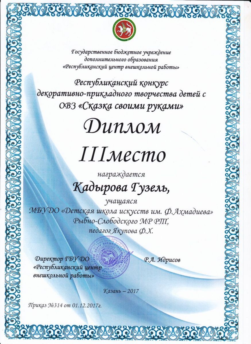 Гузель Кадырова - Диплом III-й степени Республиканского конкурса декоративно-приклданого творчества детей с ОВЗ "Сказка своими руками" (апрель 2018г.)