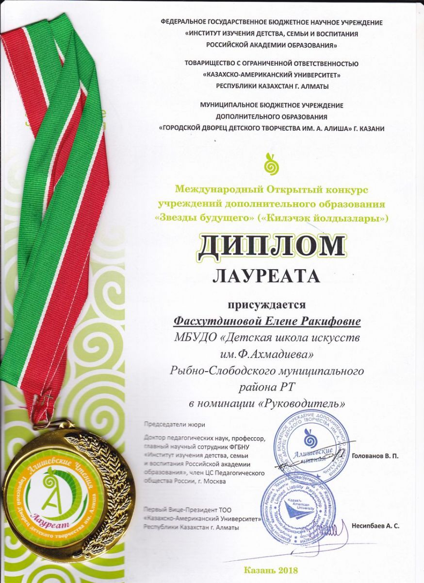 - Сафина Алсу Шамильевна - Диплом II-й степени Республиканского конкурса методических разработок "Перспективы и ресурсы развития системы дополнительного образования в Республике Татарстан"в номинации "Художественная направленность. Музыкальное направление. Учебно-методические пособия" (февраль 2018г.)