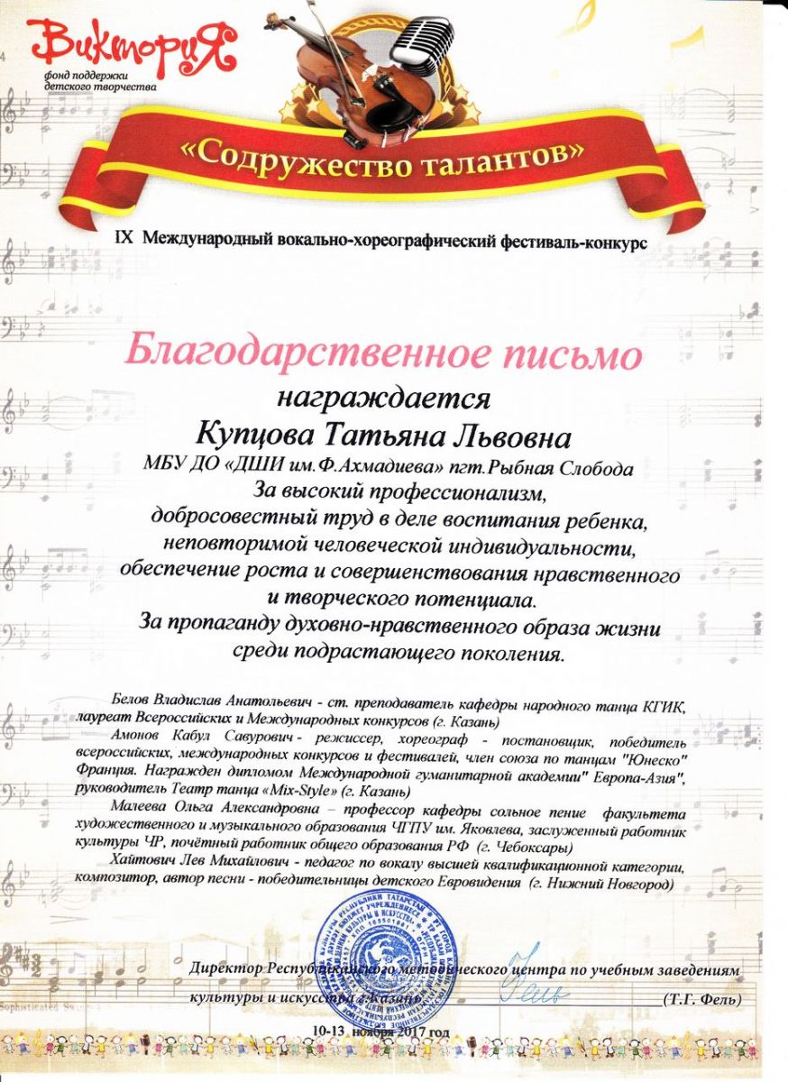 - Купцова Татьяна Львовна - Благодарственное письмо IX-го Международного вокально-хореографического фестиваля-конкурса "Содружество талантов" за высокий профессионализм (ноябрь 2017г.)