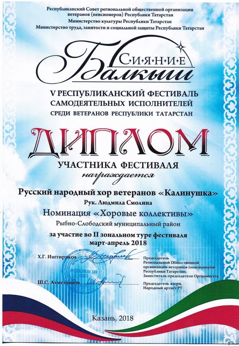 Смолина Людмила Михайловна - Диплом участника V-го Республиканского фестиваля самодеятельных исполнителей среди ветеранов Республики Татарстан в номинации "Хоровые коллективы" (март 2018г.)