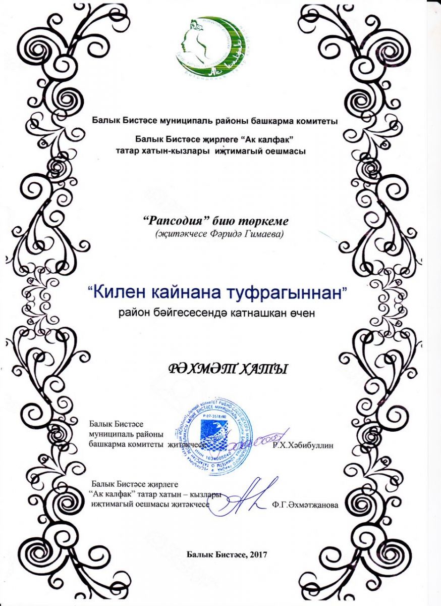 Фарида Гимаева - Благодарственное письмо местного отделения Всемирной общественной организации татарских женщин "Ак Калфак" (декабрь 2017г.)