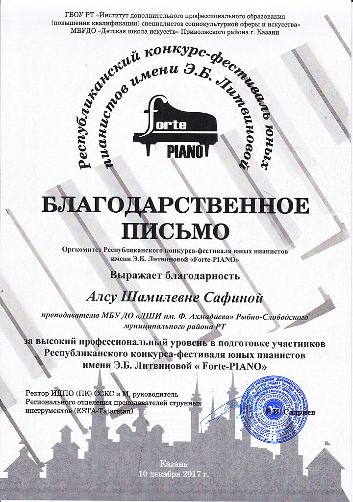 - Сафина Алсу Шамилевна - Благодарственное письмо оргкомитета Республиканского конкурса-фестиваля юных пианистов имени Э.Б. Литвиновой "FortePIANO" (декабрь 2017г.)