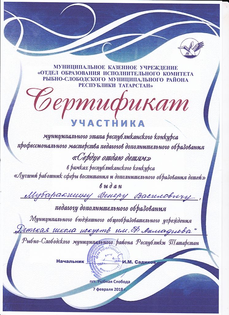 - Мубаракшин Венер Василович - Сертификат участника районного этапа Республиканского конкурса профессионального мастерства педагогов дополнительного образования "Сердце отдаю детям" в рамках республиканского конкурса "Лучший работник сферы воспитания и дополнительного образования детей"(февраль 2018г.)