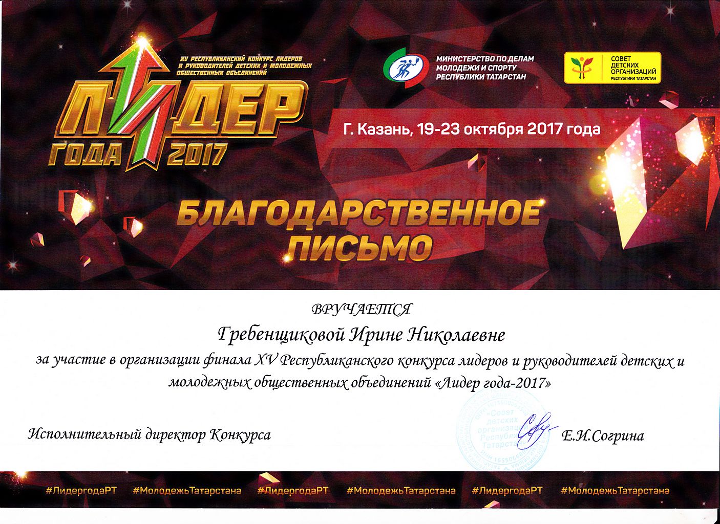 - Гребенщикова Ирина Николаевна - Благодарственное письмо за участие в организации XV-го Республиканского конкурса лидеров и руководителей детских и молодежных общественных объединений "Лидер года - 2017" (октябрь 2017г.)