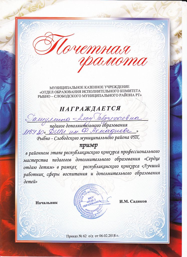- Галиуллина Алсу Габдулхаевна - Диплом за II-е место в районном этапе Республиканского конкурса профессионального мастерства педагогов дополнительного образования "Сердце отдаю детям" в рамках республиканского конкурса "Лучший работник сферы воспитания и дополнительного образования детей"(февраль 2018г.)