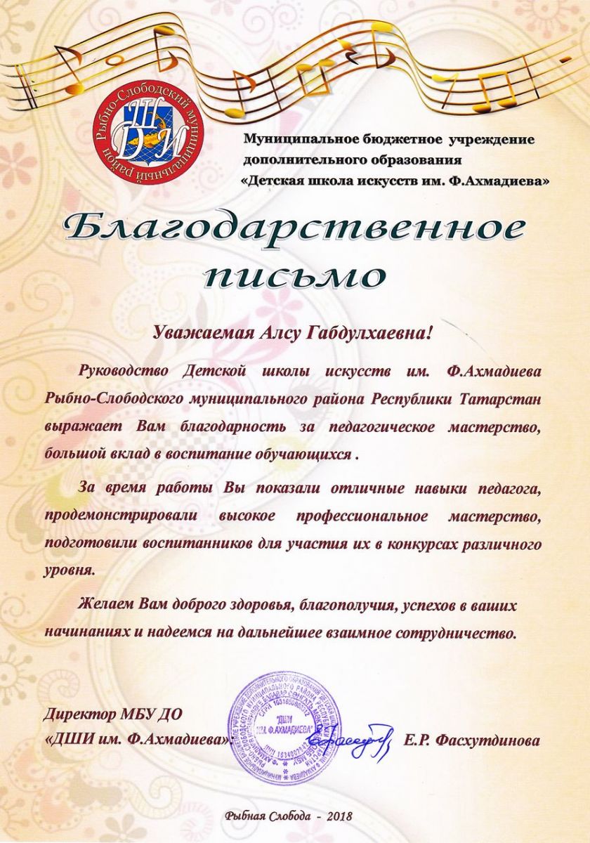 Галиуллина Алсу Габдулхаевна - Благодарственное письмо ДШИ им. Ф.Ахмадиева (апрель 2018г.)