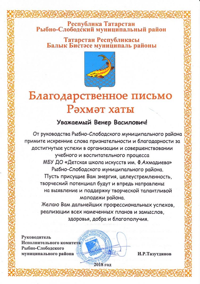 Мубаракшин Венер Василович - Благодарственное письмо Главы Рыбно-Слободского муниципального района (апрель 2018г.)