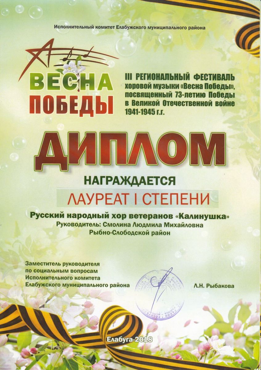 - Смолина Людмила Мийхайловна - Диплом Лауреата I степени III-го Регаионального фестиваля хоровой музыки "Весна Победы" посвященный 73-й годовщине Победы в Великой Отечественной войне 1941-1945 гг. (апрель 2018г.)