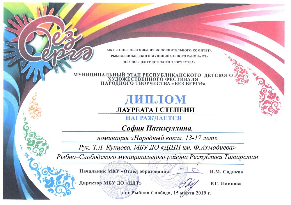 - София Нагимуллина - Диплом Лауреата I степени муниципального этапа Республиканского детского художественного фестиваля народного творчества "Без берге" в номинации "Народный вокал.13-17 лет"(март 2019г.)