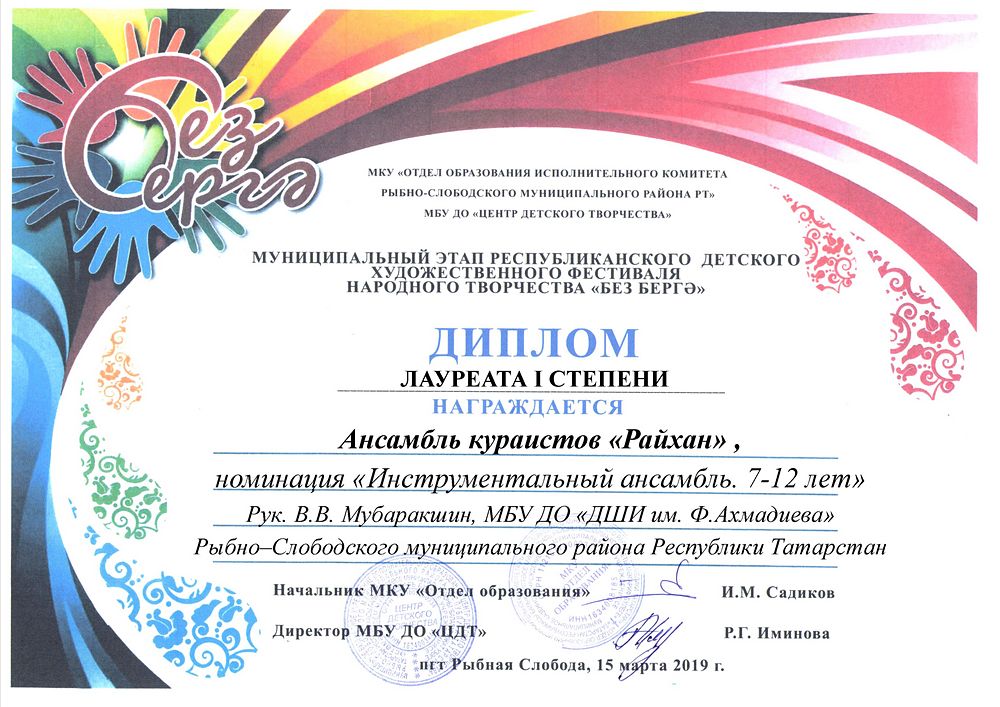Ансамбль кураистов "Райхан" - Диплом Лауреата I степени муниципального этапа Республиканского детского художественного фестиваля народного творчества "Без берге" в номинации "Инструментальный ансамбль"(март 2019г.)